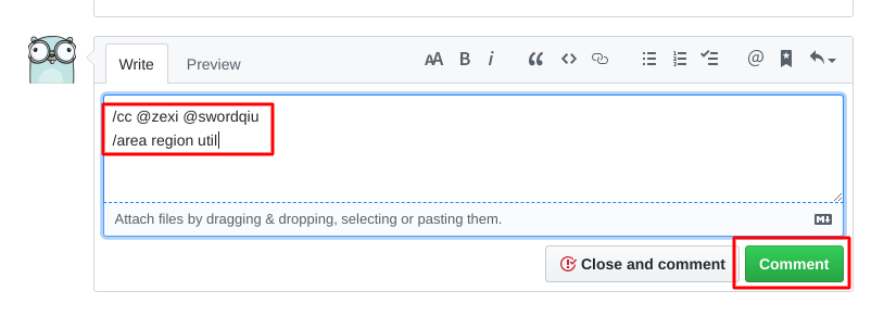 - 或者通过添加评论的方式来完成上一步;评论 “/cc” 并 @ 相关人员完成设置reviewer,评论/area 并填写label完成设置Labels