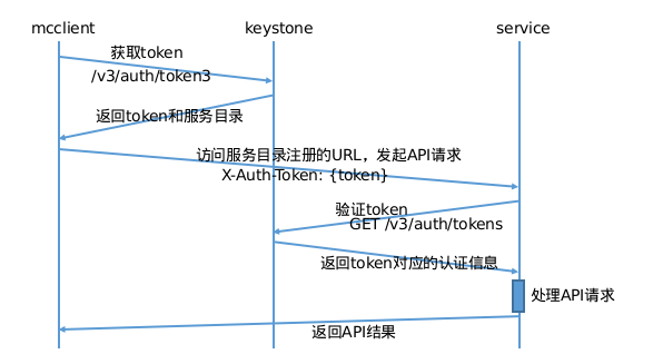 - 后端服务向keystone验证该token,获得用户的身份信息,执行后续API的流程