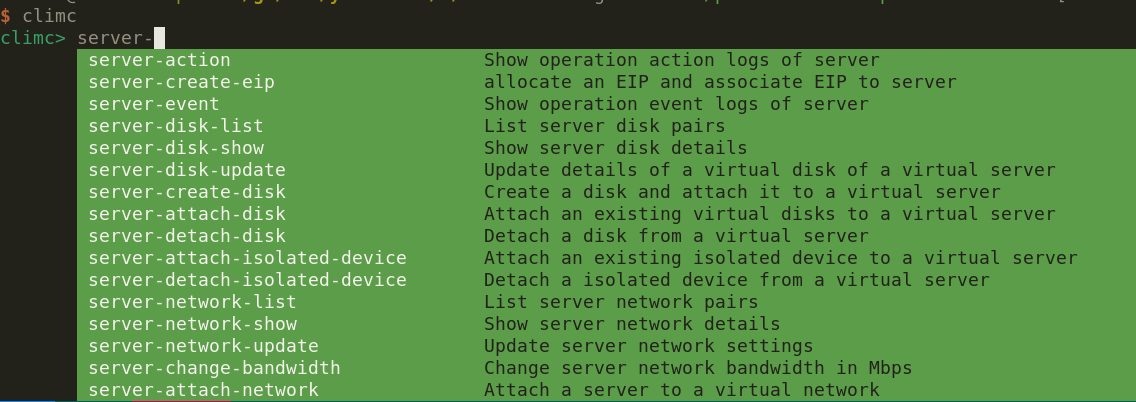 - 交互模式: 在 shell 输入 climc,就会进入交互模式,这种模式下有自动补全和参数提示。