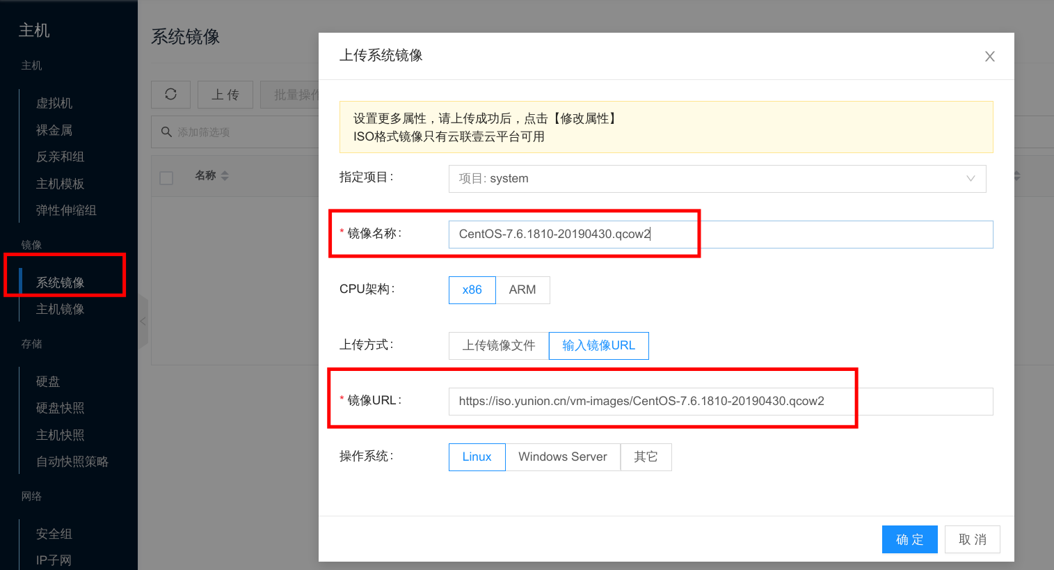 - 上传方式选择 ‘输入镜像URL’,镜像 URL 为: https://iso.yunion.cn/vm-images/CentOS-7.6.1810-20190430.qcow2
