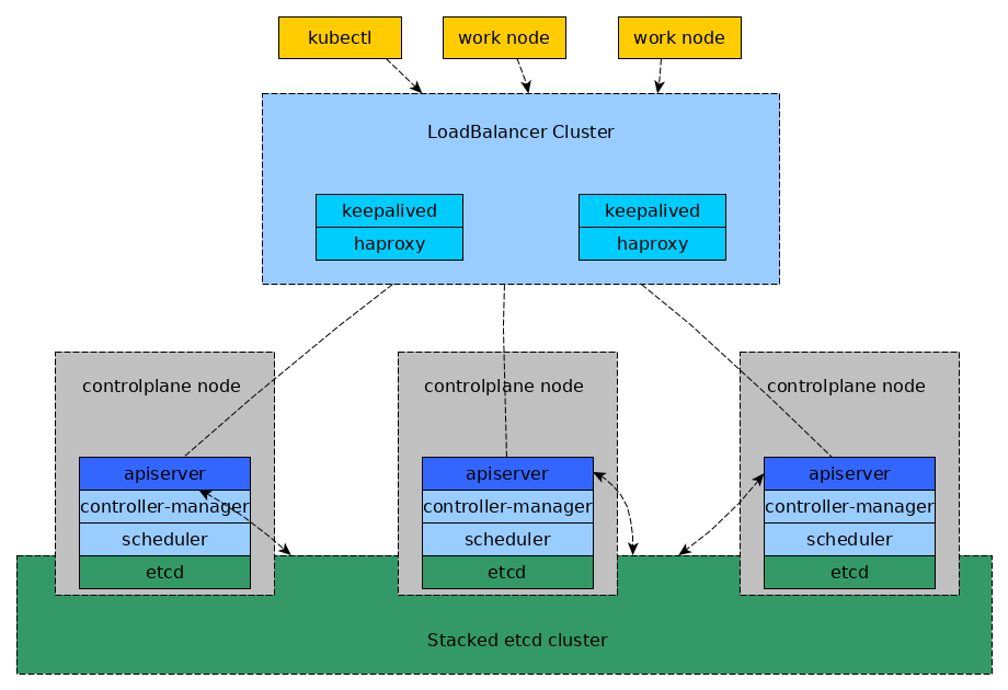 两个节点上面分别部署 keepalived 和 haproxy 组成负载均衡集群,haproxy 的 backend 为后端的 kubernetes control plane node,vip(虚ip) 在这两个节点之间漂移形成高可用。