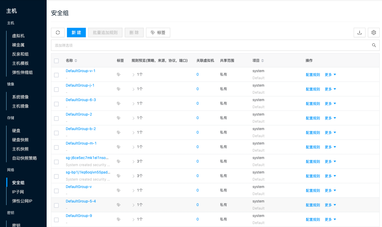 入口:在云管平台单击左上角导航菜单,在弹出的左侧菜单栏中单击 “主机/网络/安全组” 菜单项,进入安全组页面。