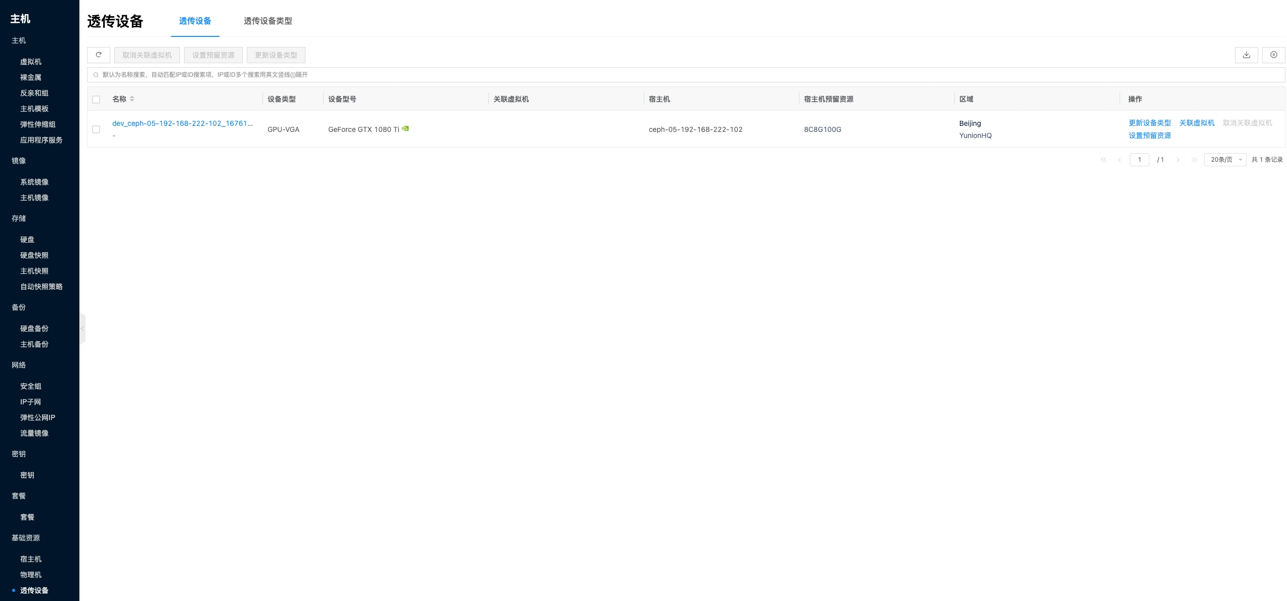 入口:在云管平台单击左上角导航菜单,在弹出的左侧菜单栏中单击 “主机/基础资源/透传设备” 菜单项,进入透传设备页面。