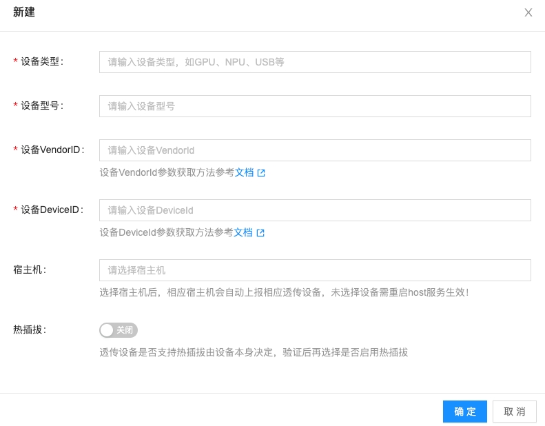 - 热插拔:默认关闭,透传设备是否支持热插拔由设备本身决定,验证后再选择是否启用热插拔。