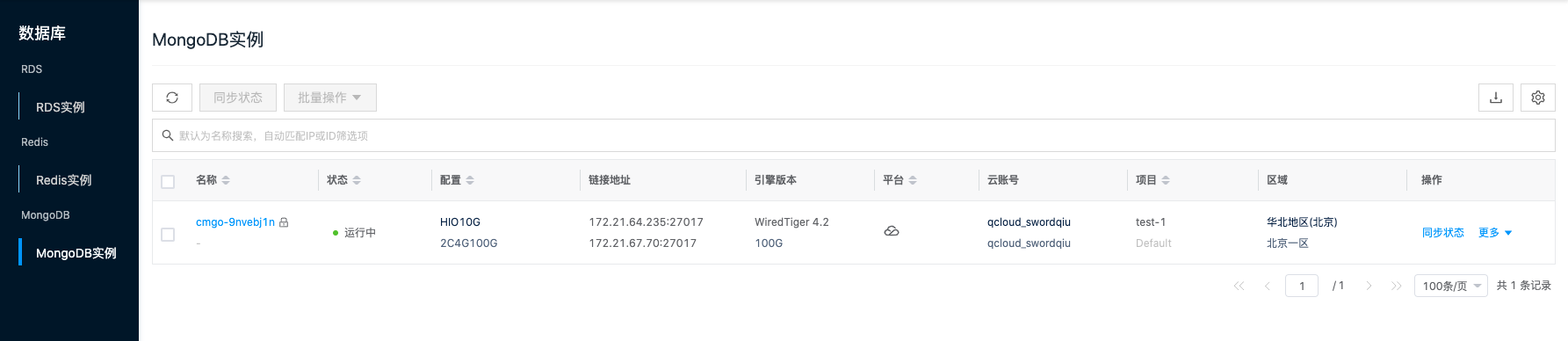 - 在MongoDB实例页面,单击列表右侧操作列 “同步状态” 按钮,同步MongoDB实例状态。