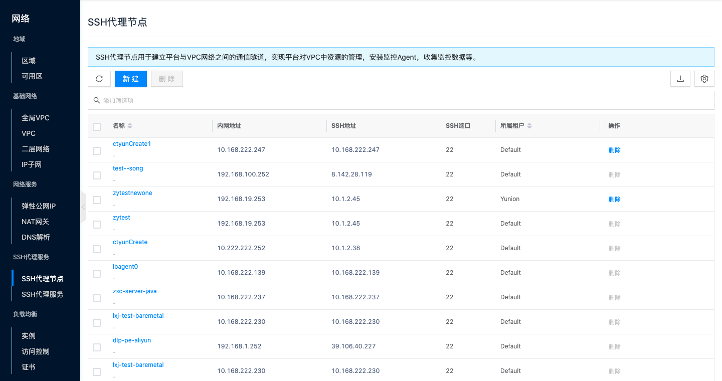 - 在SSH代理节点页面,单击SSH代理节点右侧操作列 “删除” 按钮,弹出操作确认对话框。